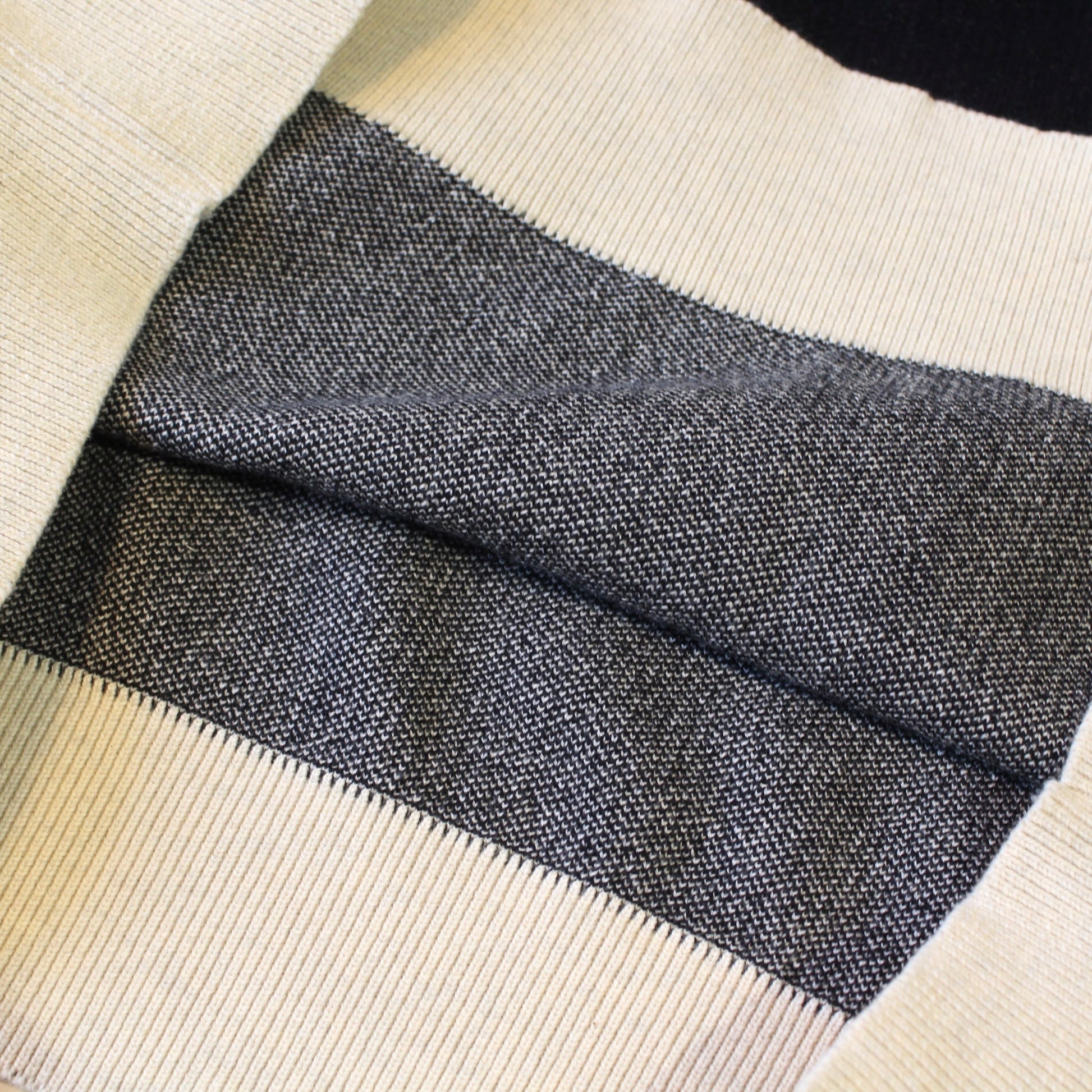 布料是混紡面紗編織而成,將染色與未染色棉混紡,以雙面提花針織工藝製成!